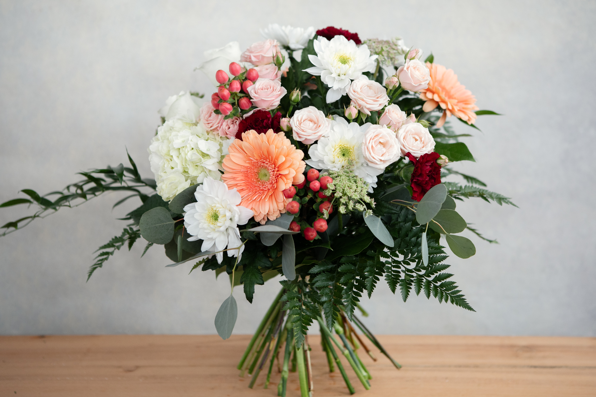 The Lucky Lady Bouquet is stunning! Created using a beautiful mix of fresh flowers in Peaches, White & Burgundy, this one is sure to please!