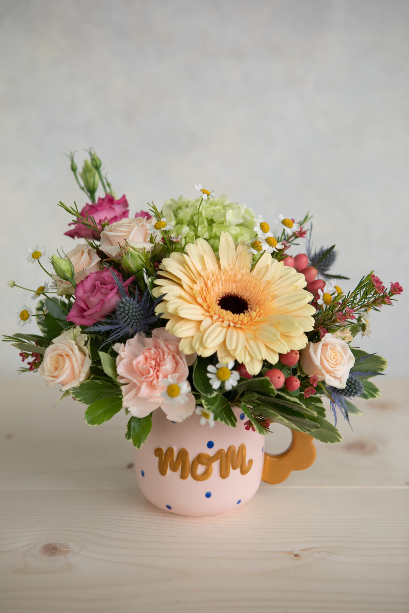 A sweet surprise for Mom, this charming mug arrangement is filled with a soft, garden-style mix of fresh blooms in warm peaches and buttery tones with pops of pink. Designed in a keepsake “mom” mug, it’s the perfect blend of thoughtful and practical—something she can enjoy long after Mother’s Day.