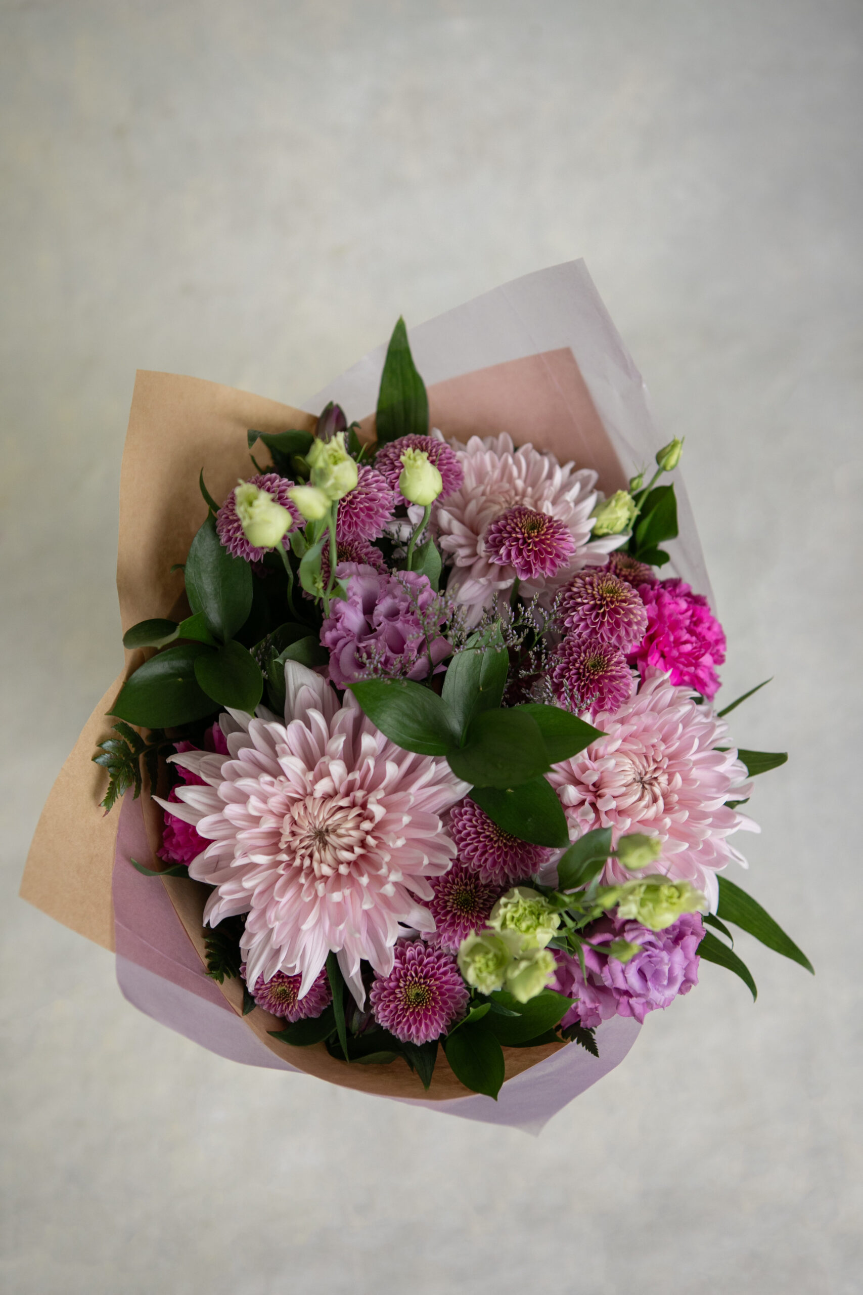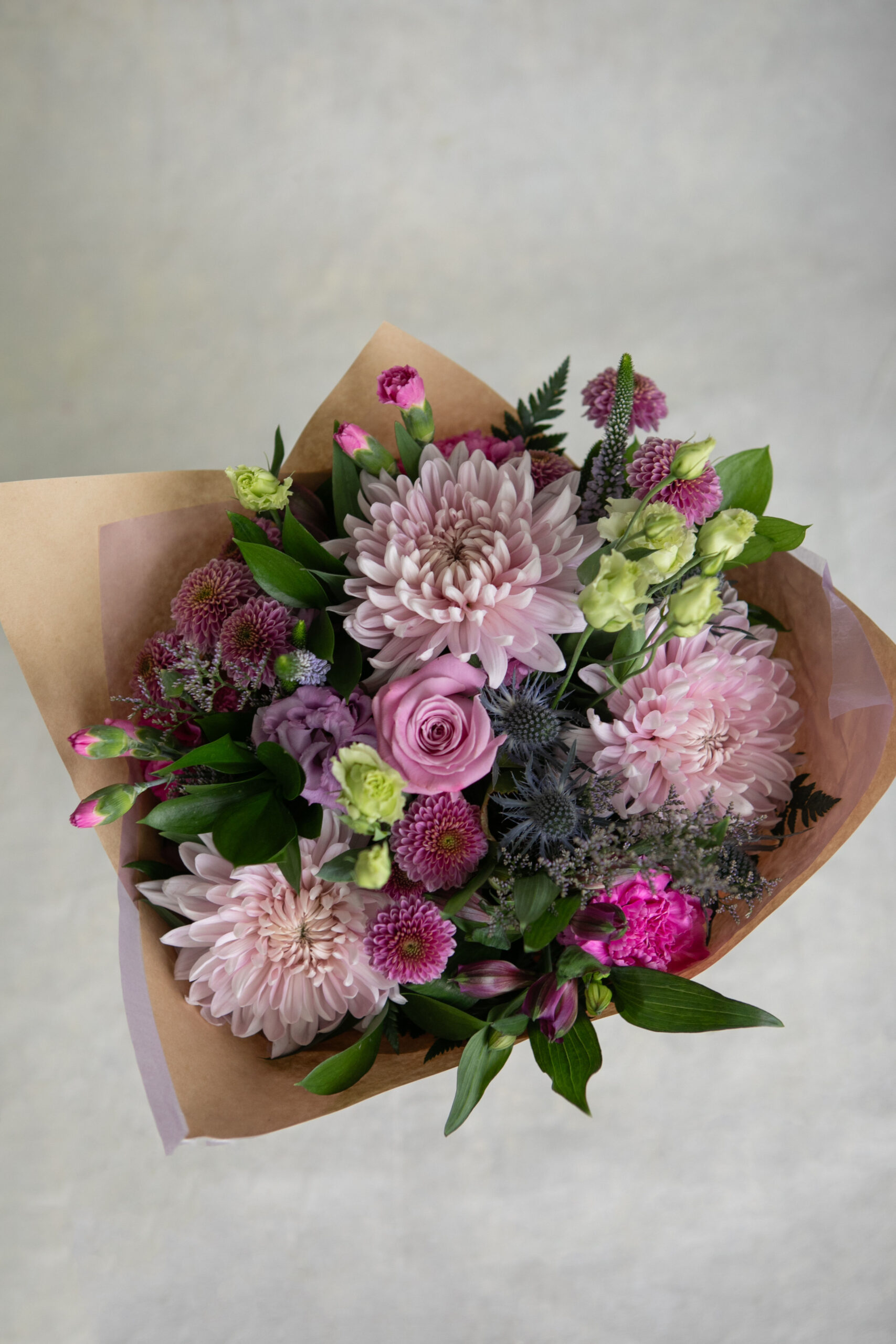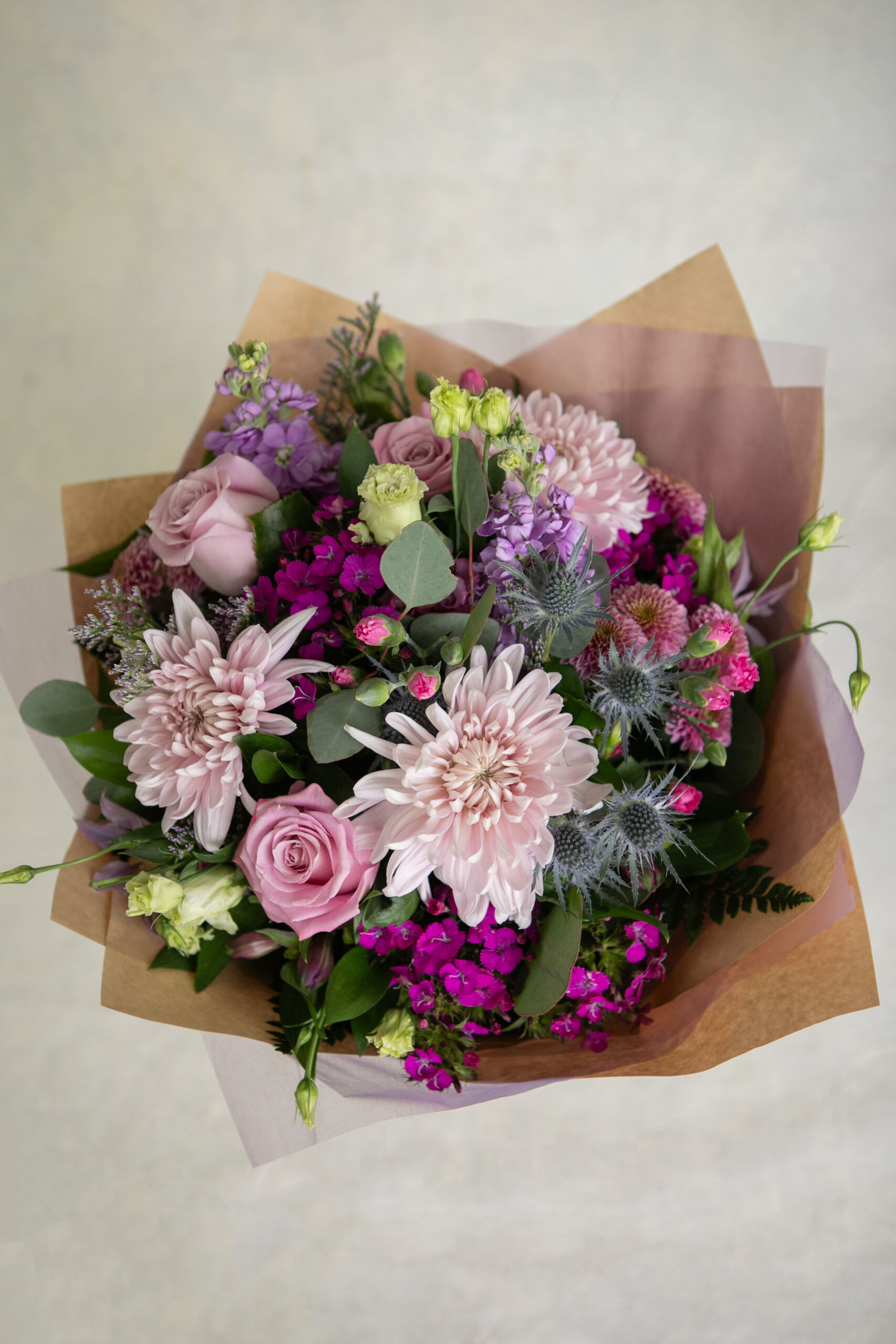 The Monochromatic Bouquet is a visually appealing design that has an interesting mix of textures and flowers that is created using the colour Purple in a variety of shades.