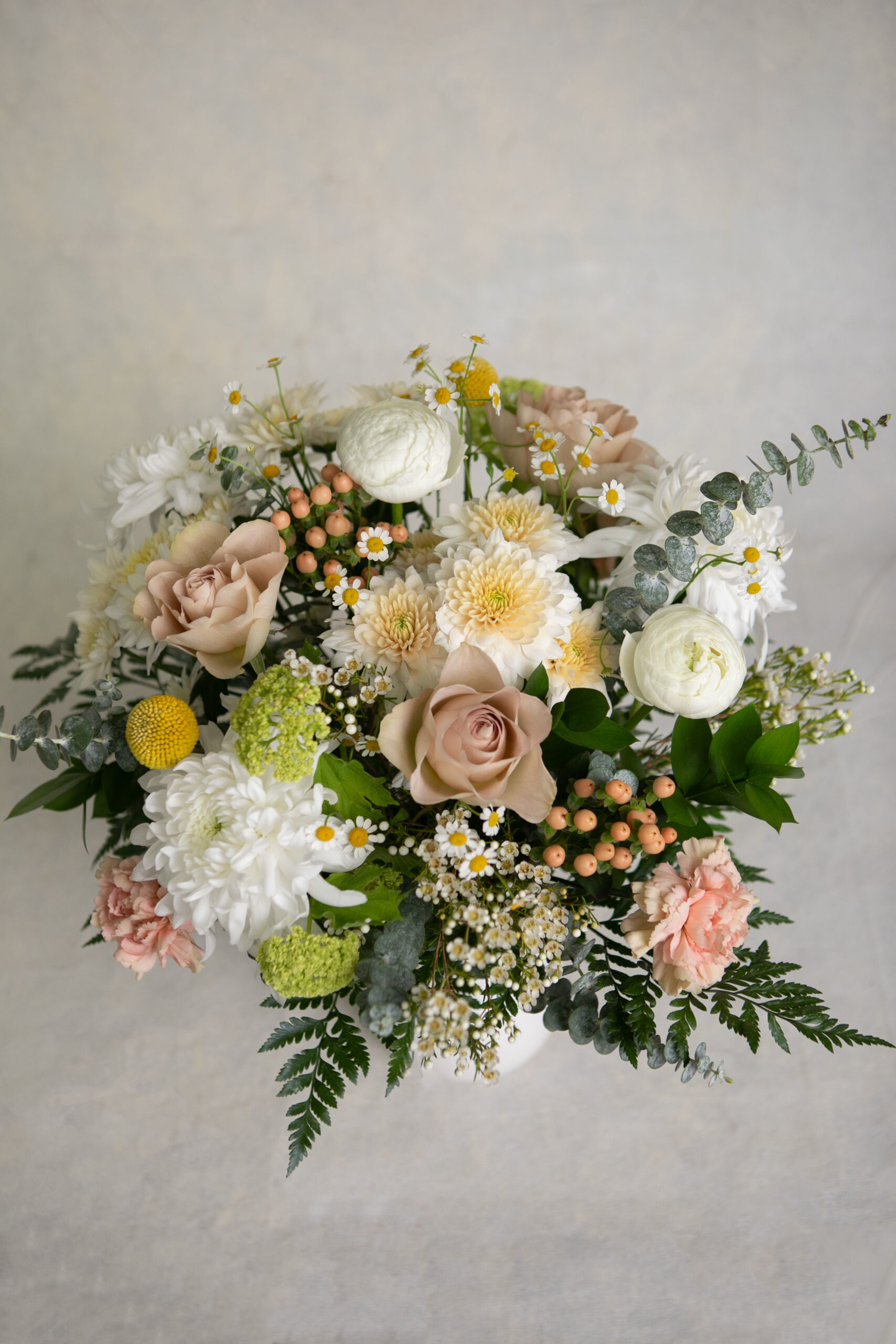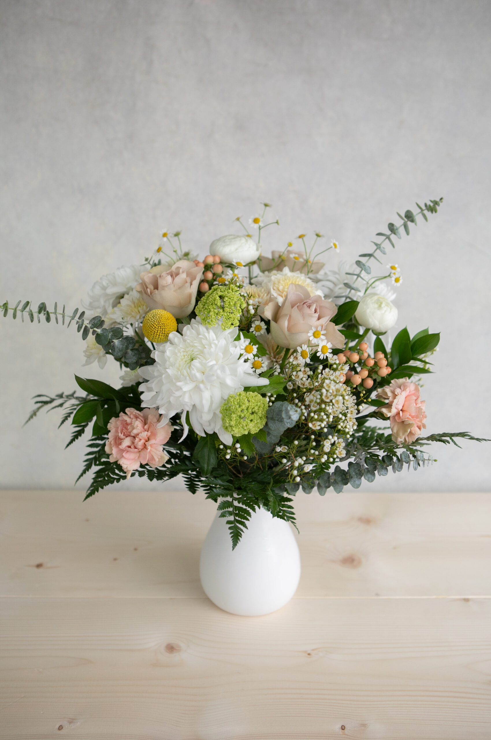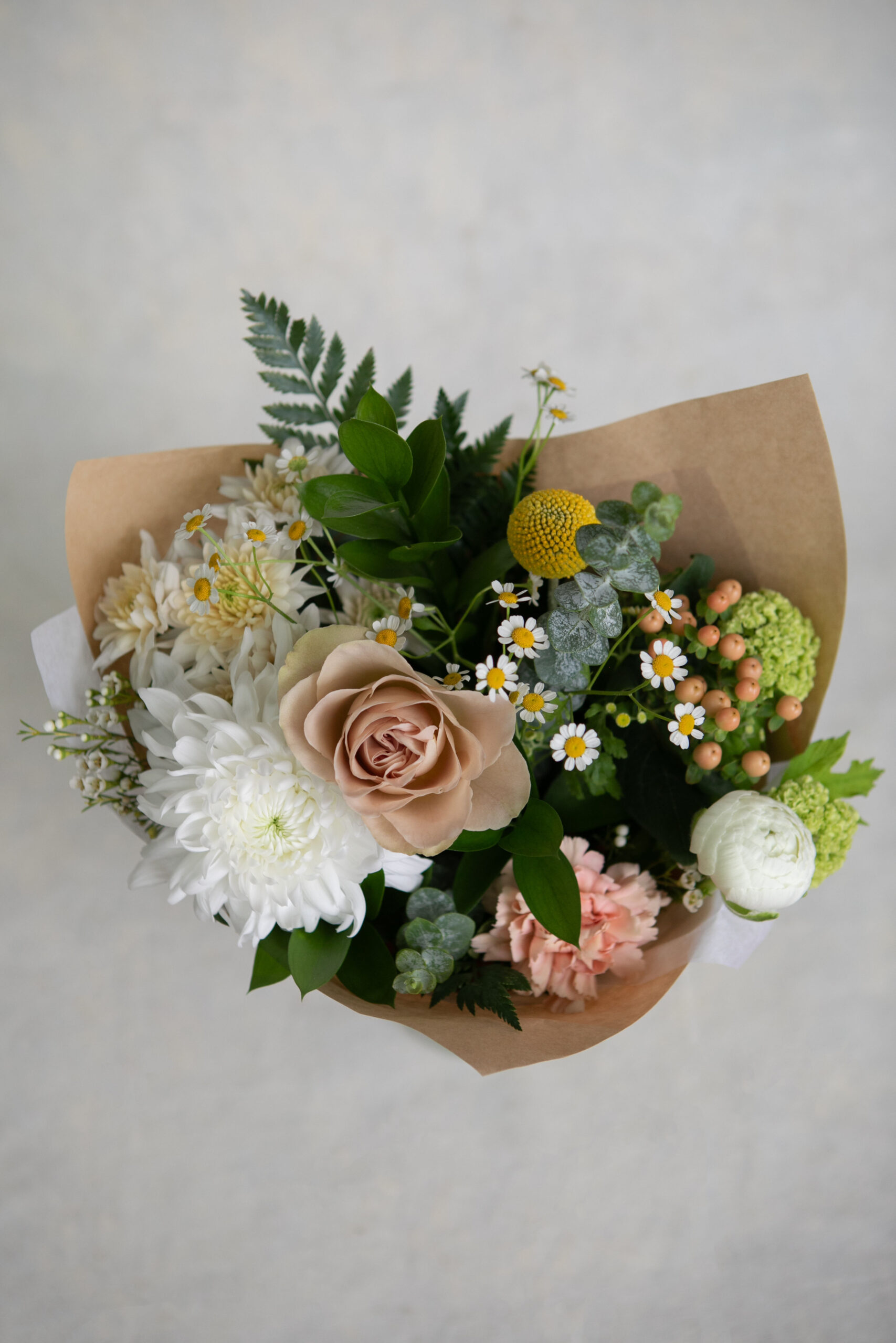 This design includes a variety of fresh flowers and foliage in a beautiful muted colour palette that has pops of brightness.