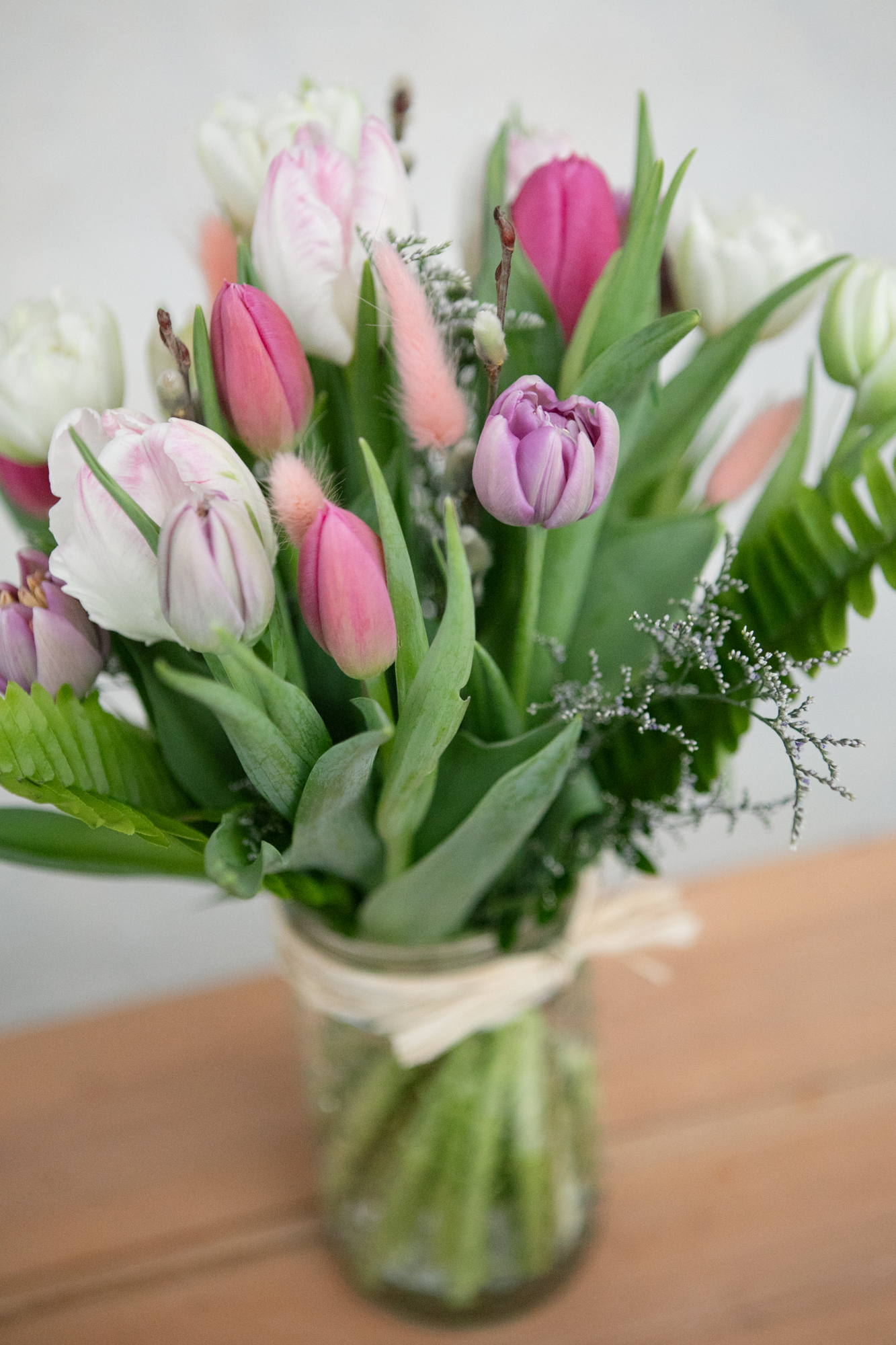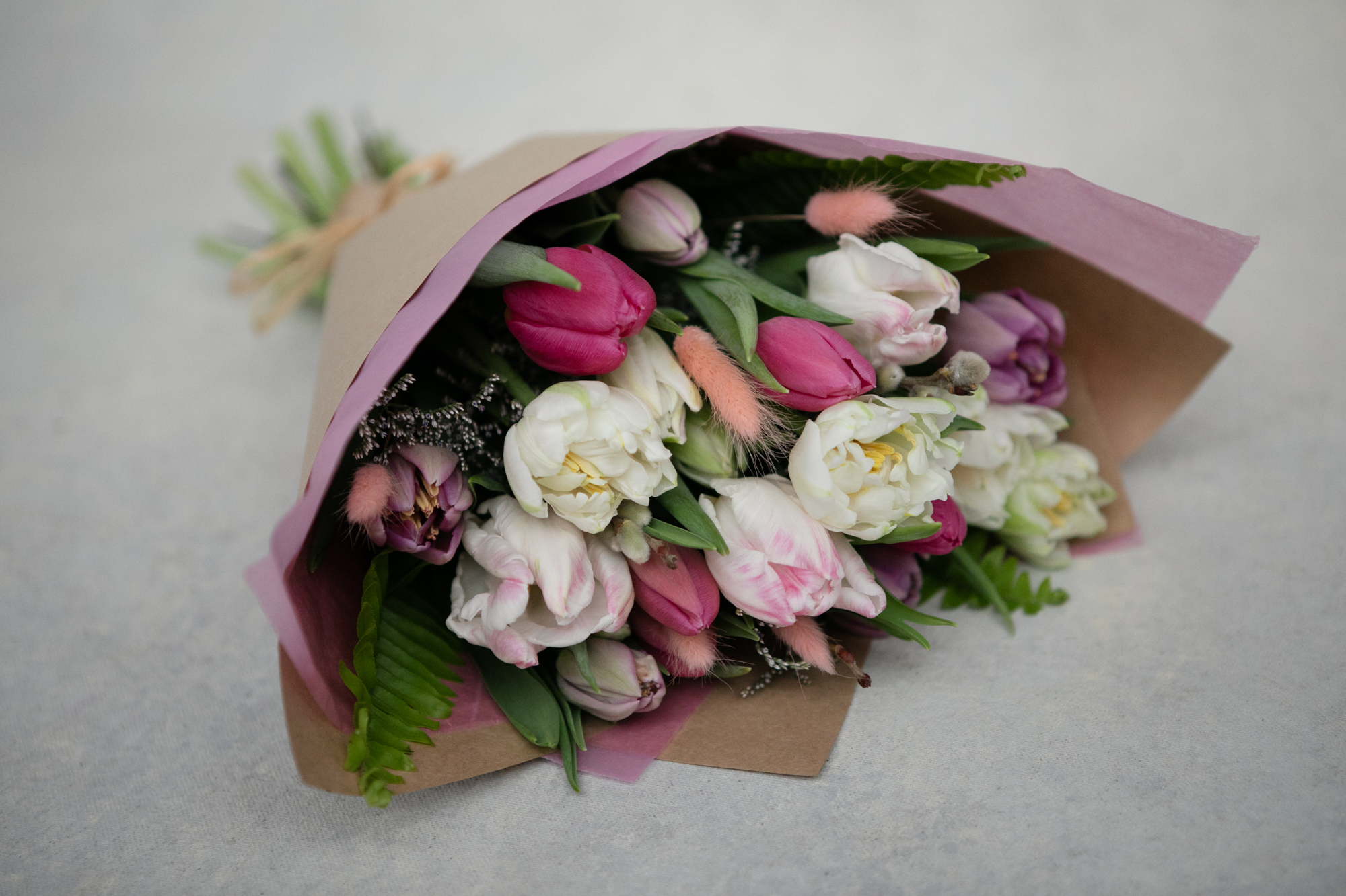 The Spring Kisses Arrangement is created using a beautiful mix of Tulips in Pinks, Peaches, Purples & Whites, accented with filler flowers for texture & lush greenery.