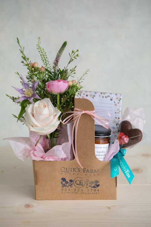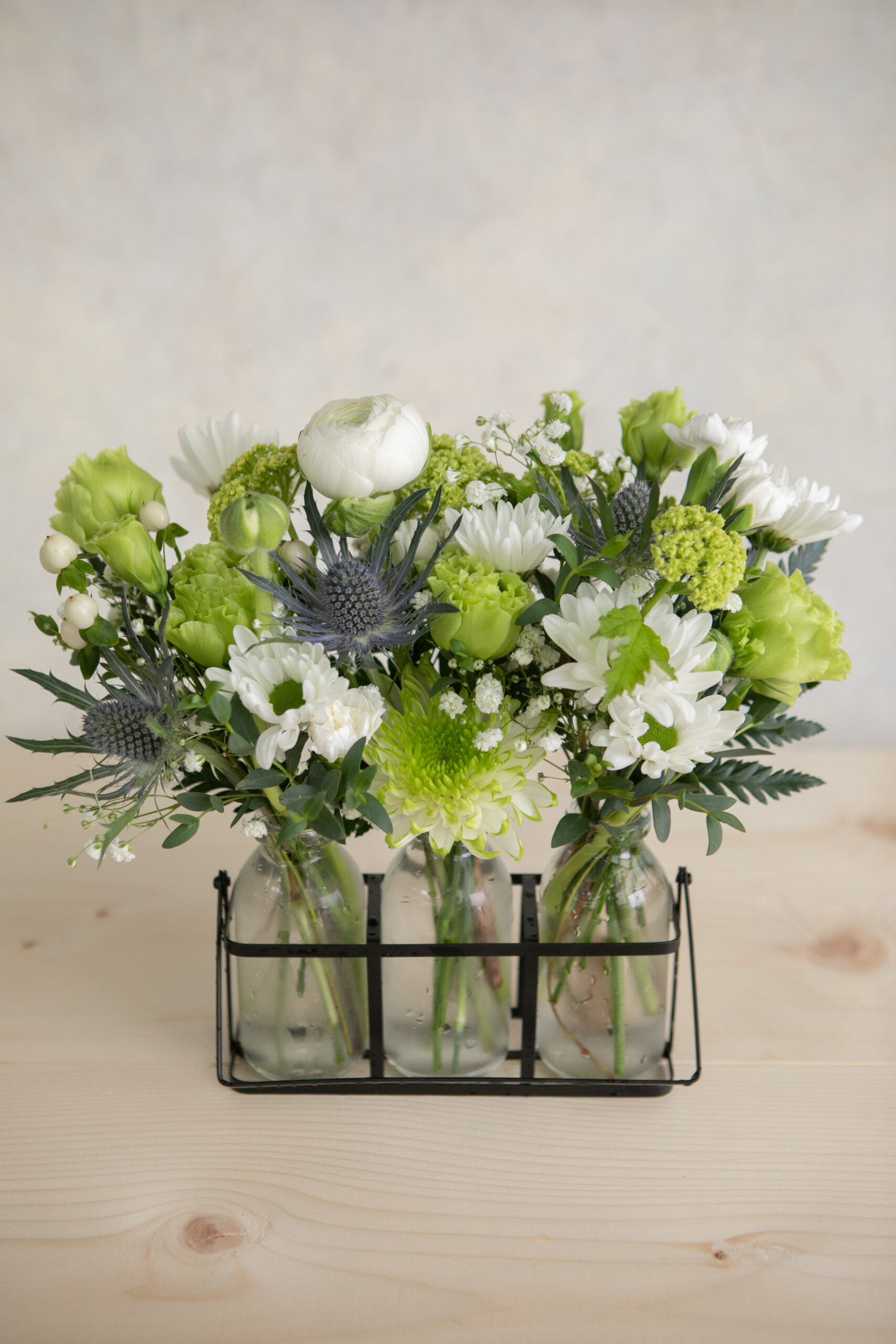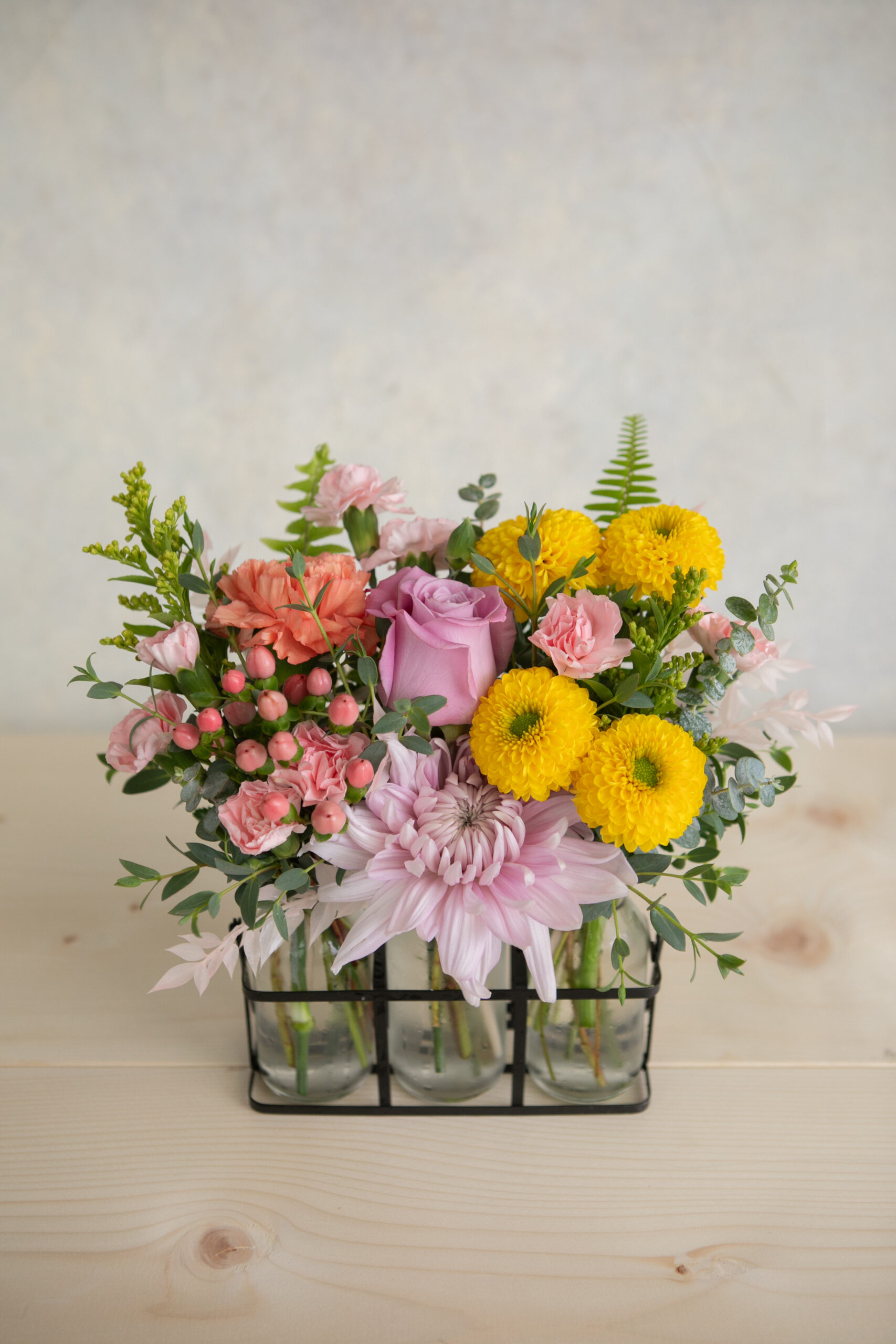 3 Mini Bottles in a Rustic Metal Caddy filled with a beautiful mix of fresh flowers in your choice of colour palette.