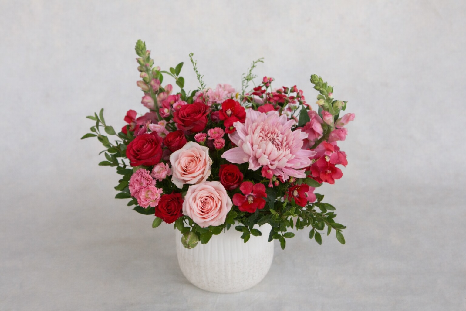 This design includes a variety of fresh flowers and foliage and is designed in a white ceramic container.